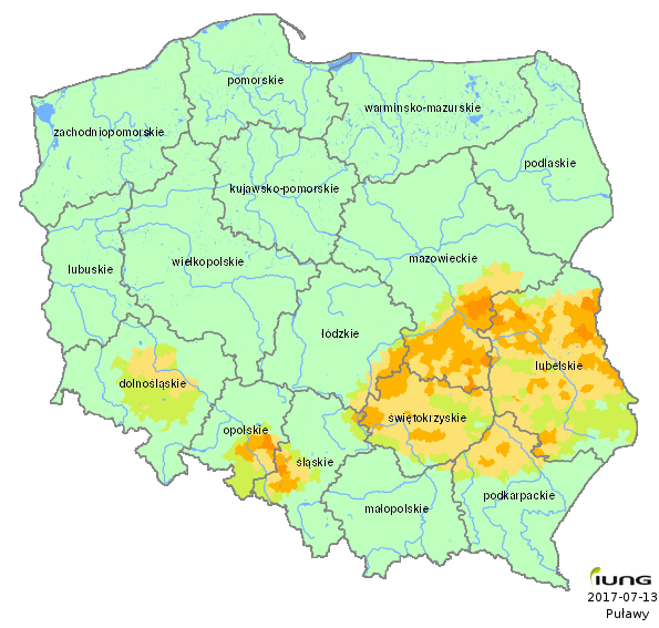 IUNG-PIB zgodnie z wymogami Obwieszczenia opracował wartości klimatycznego bilansu wodnego dla wszystkich gmin Polski (2478 gmin) oraz w oparciu o kategorie gleb określił w tych gminach aktualny stan zagrożenia suszą rolniczą dla następujących upraw: zbóż ozimych i jarych, kukurydzy na ziarno i kiszonkę, rzepaku i rzepiku, ziemniaka, buraka cukrowego, chmielu, tytoniu, warzyw gruntowych, krzewów i drzew owocowych, truskawek oraz roślin strączkowych. .....