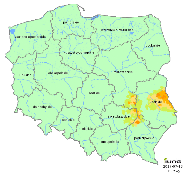 IUNG-PIB zgodnie z wymogami Obwieszczenia opracował wartości klimatycznego bilansu wodnego dla wszystkich gmin Polski (2478 gmin) oraz w oparciu o kategorie gleb określił w tych gminach aktualny stan zagrożenia suszą rolniczą dla następujących upraw: zbóż ozimych i jarych, kukurydzy na ziarno i kiszonkę, rzepaku i rzepiku, ziemniaka, buraka cukrowego, chmielu, tytoniu, warzyw gruntowych, krzewów i drzew owocowych, truskawek oraz roślin strączkowych. .....