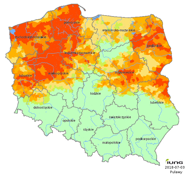 IUNG-PIB zgodnie z wymogami Obwieszczenia opracował wartości klimatycznego bilansu wodnego dla wszystkich gmin Polski (2478 gmin) oraz w oparciu o kategorie gleb określił w tych gminach aktualny stan zagrożenia suszą rolniczą dla następujących upraw: zbóż ozimych i jarych, kukurydzy na ziarno i kiszonkę, rzepaku i rzepiku, ziemniaka, buraka cukrowego, chmielu, tytoniu, warzyw gruntowych, krzewów i drzew owocowych, truskawek oraz roślin bobowatych. .....