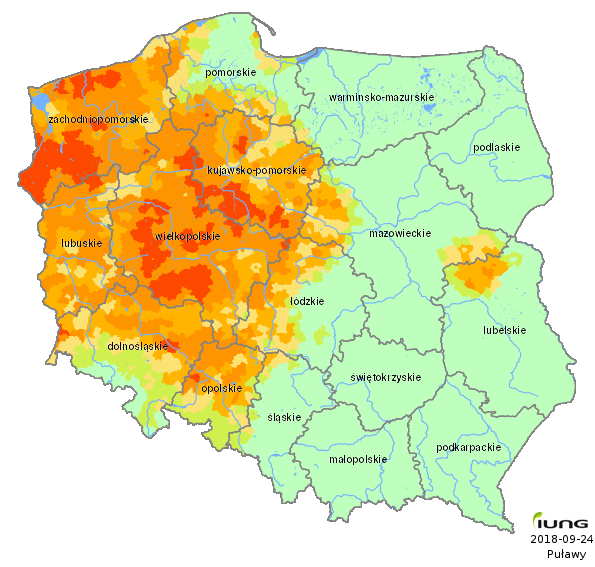 IUNG-PIB zgodnie z wymogami Obwieszczenia opracował wartości klimatycznego bilansu wodnego dla wszystkich gmin Polski (2478 gmin) oraz w oparciu o kategorie gleb określił w tych gminach aktualny stan zagrożenia suszą rolniczą dla następujących upraw: ziemniaka, buraka cukrowego, rzepaku i rzepiku. .....