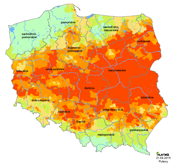 The Institute of Soil Science and Plant Cultivation - State Research Institute in accordance with an Act from the Minister of Agriculture and Rural Development has developed the climatic water balance for all Polish municipalities (3,064 municipalities), and based on the soils categories have identified in those municipalities the current agricultural drought risk for the following crops: winter and spring cereals, corn for grain and silage, oilseed rape and turnip rape, sugar beet, potatoes, hops, tobacco, field vegetables, shrubs and fruit trees and strawberries and legumes. .....