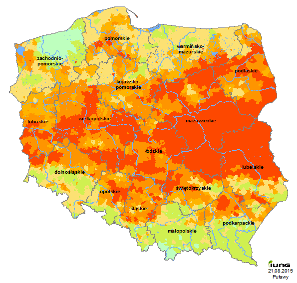 The Institute of Soil Science and Plant Cultivation - State Research Institute in accordance with an Act from the Minister of Agriculture and Rural Development has developed the climatic water balance for all Polish municipalities (3,064 municipalities), and based on the soils categories have identified in those municipalities the current agricultural drought risk for the following crops: winter and spring cereals, corn for grain and silage, oilseed rape and turnip rape, sugar beet, potatoes, hops, tobacco, field vegetables, shrubs and fruit trees and strawberries and legumes. .....