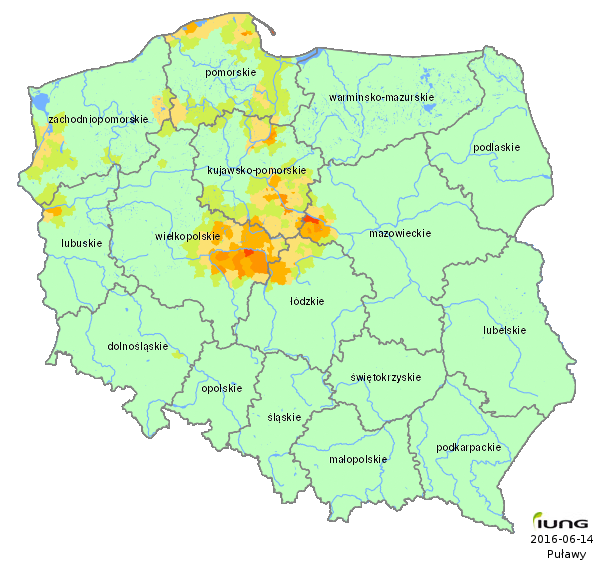Instytut Uprawy Nawożenia i Gleboznawstwa – Państwowy Instytut Badawczy w Puławach, zgodnie z wymogami Obwieszczenia Ministra Rolnictwa i Rozwoju Wsi opracował wartości klimatycznego bilansu wodnego dla wszystkich gmin Polski (2478 gmin) oraz w oparciu o kategorie gleb określił w tych gminach aktualny stan zagrożenia suszą rolniczą dla następujących upraw: zbóż ozimych i jarych, rzepaku i rzepiku, buraka cukrowego, krzewów i drzew owocowych oraz truskawek za okres od 11 kwietnia do 10 czerwca 2016 roku. .....