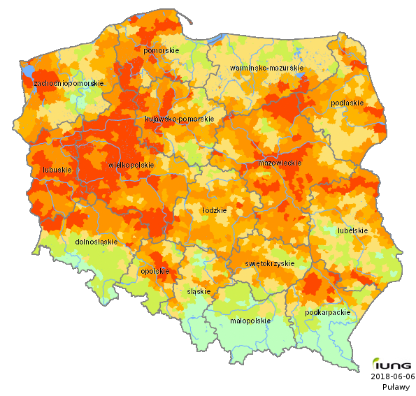 The Institute of Soil Science and Plant Cultivation – State Research Institute, in accordance with an Act of the Minister of Agriculture and Rural Development has developed the climatic water balance values for all 2478 Polish local districts (gminas) and, on the basis of soil categories, calculated the current risk of agricultural drought for the following crops: winter and spring cereals, rape and turnip rape, sugar beet, fruit shrubs and trees, and strawberries. .....