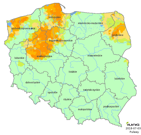 The Institute of Soil Science and Plant Cultivation – State Research Institute, in accordance with an Act of the Minister of Agriculture and Rural Development has developed the climatic water balance values for all 2478 Polish local districts (gminas) and, on the basis of soil categories, calculated the current risk of agricultural drought for the following crops: winter and spring cereals, maize for grain and maize for silage, rape and turnip rape, potato, sugar beet, hops, tobacco, ground vegetables, fruit shrubs and trees, strawberries and legumes (fabacea). .....
