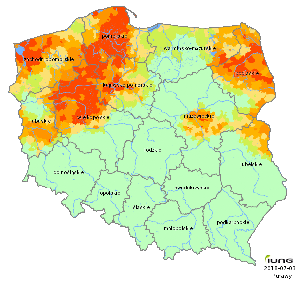 The Institute of Soil Science and Plant Cultivation – State Research Institute, in accordance with an Act of the Minister of Agriculture and Rural Development has developed the climatic water balance values for all 2478 Polish local districts (gminas) and, on the basis of soil categories, calculated the current risk of agricultural drought for the following crops: winter and spring cereals, maize for grain and maize for silage, rape and turnip rape, potato, sugar beet, hops, tobacco, ground vegetables, fruit shrubs and trees, strawberries and legumes (fabacea). .....
