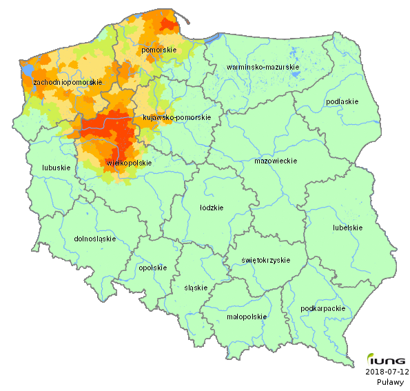 The Institute of Soil Science and Plant Cultivation – State Research Institute, in accordance with an Act of the Minister of Agriculture and Rural Development has developed the climatic water balance values for all 2478 Polish local districts (gminas) and, on the basis of soil categories, calculated the current risk of agricultural drought for the following crops: winter and spring cereals, maize for grain and maize for silage, rape and turnip rape, potato, sugar beet, hops, tobacco, ground vegetables, fruit shrubs and trees, strawberries and legumes (fabacea). .....