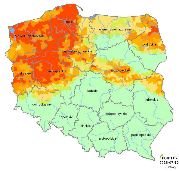 The Institute of Soil Science and Plant Cultivation – State Research Institute, in accordance with an Act of the Minister of Agriculture and Rural Development has developed the climatic water balance values for all 2478 Polish local districts (gminas) and, on the basis of soil categories, calculated the current risk of agricultural drought for the following crops: winter and spring cereals, maize for grain and maize for silage, rape and turnip rape, potato, sugar beet, hops, tobacco, ground vegetables, fruit shrubs and trees, strawberries and legumes (fabacea). .....