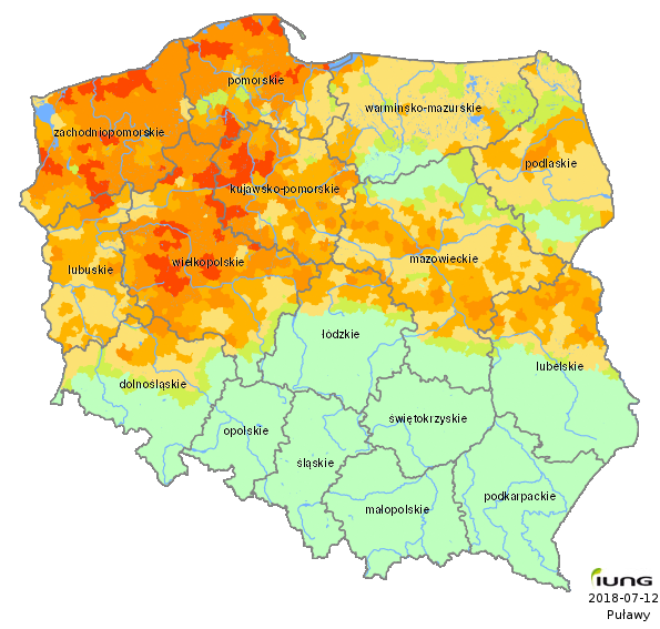The Institute of Soil Science and Plant Cultivation – State Research Institute, in accordance with an Act of the Minister of Agriculture and Rural Development has developed the climatic water balance values for all 2478 Polish local districts (gminas) and, on the basis of soil categories, calculated the current risk of agricultural drought for the following crops: winter and spring cereals, maize for grain and maize for silage, rape and turnip rape, potato, sugar beet, hops, tobacco, ground vegetables, fruit shrubs and trees, strawberries and legumes (fabacea). .....