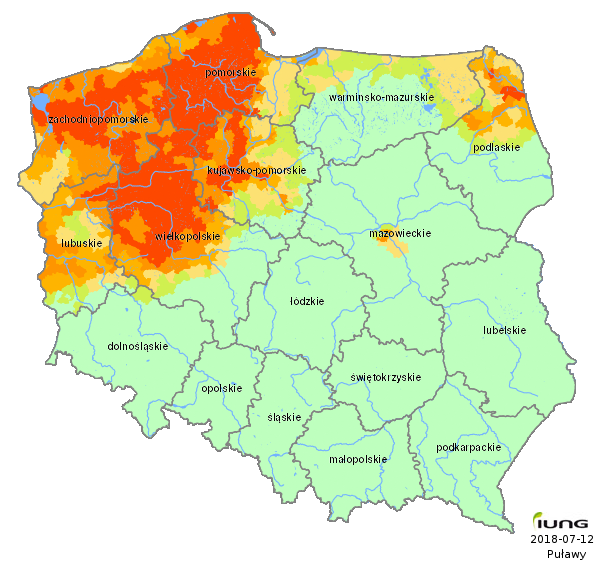 The Institute of Soil Science and Plant Cultivation – State Research Institute, in accordance with an Act of the Minister of Agriculture and Rural Development has developed the climatic water balance values for all 2478 Polish local districts (gminas) and, on the basis of soil categories, calculated the current risk of agricultural drought for the following crops: winter and spring cereals, maize for grain and maize for silage, rape and turnip rape, potato, sugar beet, hops, tobacco, ground vegetables, fruit shrubs and trees, strawberries and legumes (fabacea). .....
