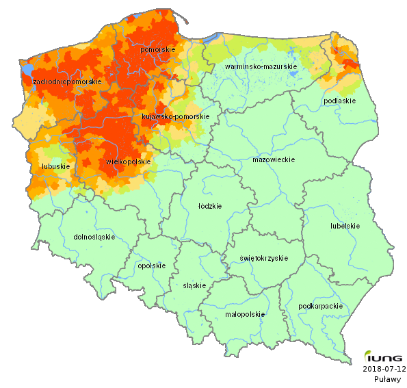The Institute of Soil Science and Plant Cultivation – State Research Institute, in accordance with an Act of the Minister of Agriculture and Rural Development has developed the climatic water balance values for all 2478 Polish local districts (gminas) and, on the basis of soil categories, calculated the current risk of agricultural drought for the following crops: winter and spring cereals, maize for grain and maize for silage, rape and turnip rape, potato, sugar beet, hops, tobacco, ground vegetables, fruit shrubs and trees, strawberries and legumes (fabacea). .....