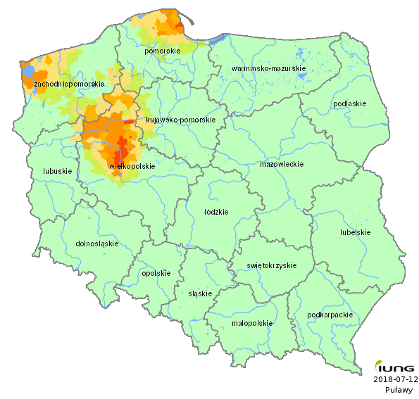 The Institute of Soil Science and Plant Cultivation – State Research Institute, in accordance with an Act of the Minister of Agriculture and Rural Development has developed the climatic water balance values for all 2478 Polish local districts (gminas) and, on the basis of soil categories, calculated the current risk of agricultural drought for the following crops: winter and spring cereals, maize for grain and maize for silage, rape and turnip rape, potato, sugar beet, hops, tobacco, ground vegetables, fruit shrubs and trees, strawberries and legumes (fabacea). .....