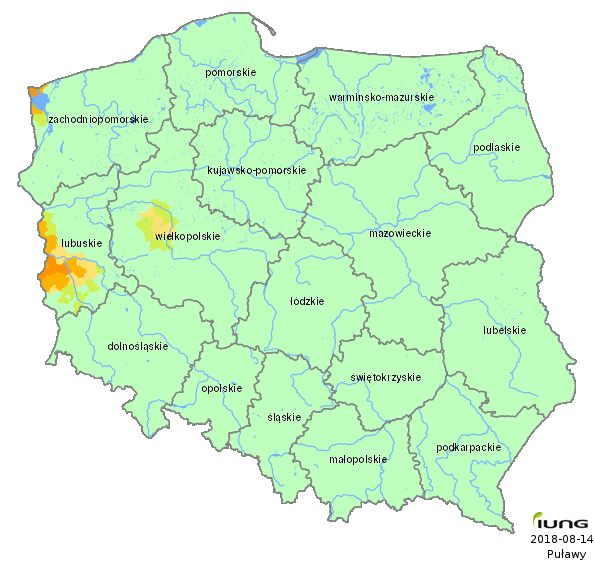 The Institute of Soil Science and Plant Cultivation – State Research Institute, in accordance with an Act of the Minister of Agriculture and Rural Development has developed the climatic water balance values for all 2478 Polish local districts (gminas) and, on the basis of soil categories, calculated the current risk of agricultural drought for the following crops: winter and spring cereals, maize for grain and maize for silage, potato, sugar beet, hops, tobacco, ground vegetables, fruit shrubs and trees, strawberries and legumes (fabacea). .....