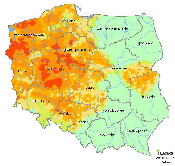 The Institute of Soil Science and Plant Cultivation – State Research Institute, in accordance with an Act of the Minister of Agriculture and Rural Development has developed the climatic water balance values for all 2478 Polish local districts (gminas) and, on the basis of soil categories, calculated the current risk of agricultural drought for the following crops: potato, sugar beet, rape and turnip rape. .....